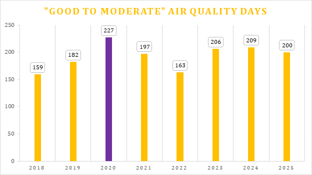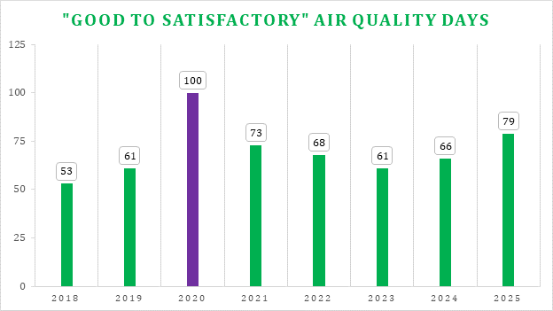 The year 2025 witnessed the highest number of days with ‘Good’ to ‘Satisfactory’ AQI (0-100), barring COVID year 2020.