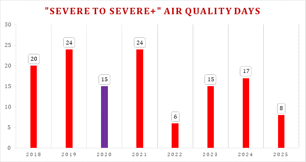 Continued, concerted and persistent efforts of all the stakeholders round the year in 2025 have further helped to improve the general air quality in Delhi as is evident from a record 79 days during 2025 with the AQI of 100 or below i.e. in ‘Good’ and ‘Satisfactory’ categories, which is lower than only the COVID year 2020. The year 2025 recorded the second lowest number of “Severe to Severe+” AQI days, i.e. 8 such days, since 2018.