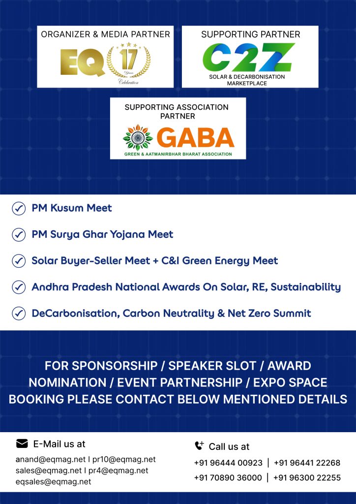 EQ Team is happy to organize 2026 – Visakhapatnam – Global Solar Expo Andhra Pradesh, PM Kusum Meet, Solar Buyer-Seller Meet, C&I Green Energy Meet, Annual Awards on Solar, RE, Sustainability and Sustainability, DeCarbonisation, Carbon Neutrality & Net Zero Summit