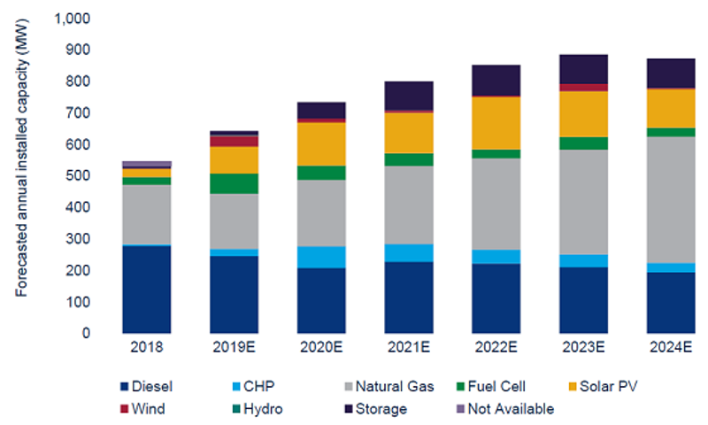 Although there is more solar capacity in the project pipeline than has been installed in all operational microgrid systems to date, the role of solar through 2024 will primarily be as a secondary capacity source, typically supporting a fossil fuel generator. Many new solar and fuel-cell-paired microgrid systems will start construction in 2019 and 2020 to take advantage of the federal Investment Tax Credit.