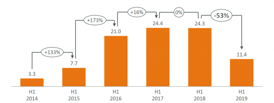 Last year, China managed to install a total of 44.26 GW (vs. 53.06 GW in 2017), with 24.4 GW and 19.96 GW of installations in H1 and H2 respectively. This year, installations from January until September 2019 witnessed a drop by 45%, with only 15.99 GW, according to China’s National Energy Administration (NEA). This slash in installation volumes was due to the NEA’s decision on May 31, 2018 to cease the approval of any new subsidized projects until further notice. The decision was taken against a backdrop of RMB 200B in outstanding FIT payments for renewable energies (i.e., wind, solar, biomass) and off-grid systems, with PV claiming a 40% share of the debt.