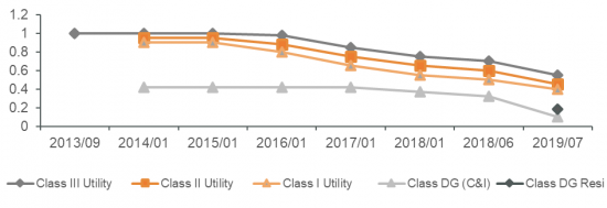 Figure 4: Solar PV FIT development, 2013–2019 in RMB/kWh